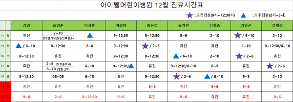 아이웰어린이병원 20.12.14~12.20 진료시간표입니다. 페이지 정보 작성자 관리자 작성일20-12-13 09:36 조회14,783회 관련링크 이전글 다음글 목록 본문 . 이전글 다음글 목록