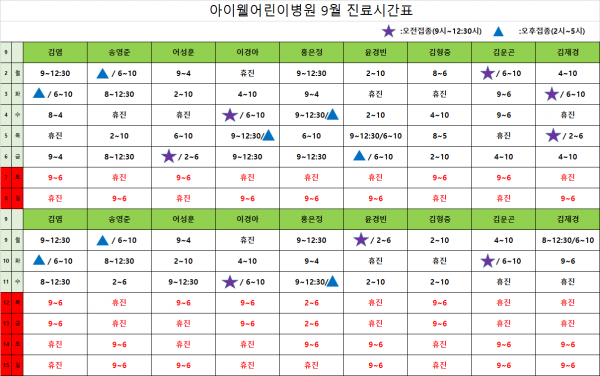 아이웰어린이병원 19.09.02~09.15 진료시간표입니다. 페이지 정보 작성자 관리자 작성일19-08-28 14:22 조회22,148회 관련링크 이전글 다음글 목록 본문 . 이전글 다음글 목록