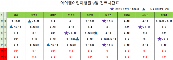 아이웰어린이병원 19.09.23~9.29 진료시간표입니다. 페이지 정보 작성자 관리자 작성일19-09-20 10:17 조회20,087회 관련링크 이전글 다음글 목록 본문 . 이전글 다음글 목록