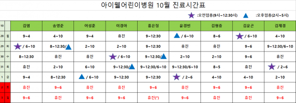 아이웰어린이병원 19.10.28~11.3 진료시간표입니다 페이지 정보 작성자 관리자 작성일19-10-23 09:37 조회20,419회 관련링크 이전글 다음글 목록 본문 . 이전글 다음글 목록