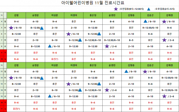 아이웰어린이병원 19.11.04~11.17 진료시간표입니다 페이지 정보 작성자 관리자 작성일19-10-30 09:14 조회22,116회 관련링크 이전글 다음글 목록 본문 11월 진료부터 온라인예약은 똑딱이 어플에서만 가능하십니다. 이전글 다음글 목록