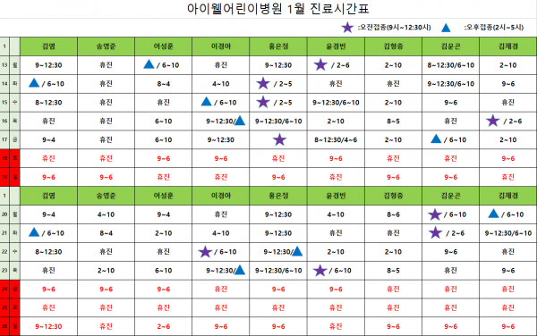 아이웰어린이병원 20.01.13~1.26일 진료 시간표입니다 페이지 정보 작성자 관리자 작성일20-01-08 10:22 조회20,979회 관련링크 이전글 다음글 목록 본문 1월 25일 설명절 당일은 아이웰어린이병원 휴무일 입니다. 병원이용에 불편을 드려 죄송합니다. 이전글 다음글 목록