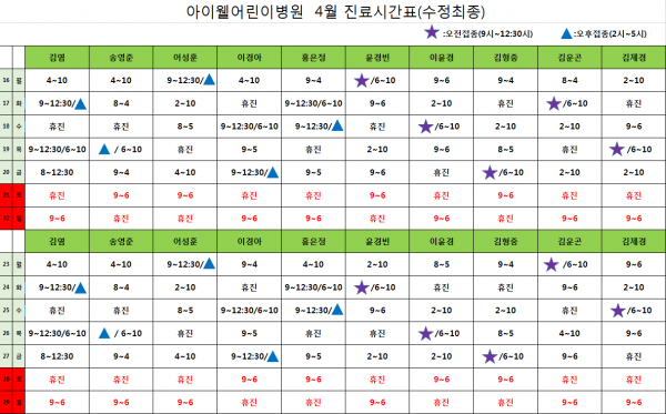 아이웰어린이병원 4.16~4.29 시간표입니다. 페이지 정보 작성자 관리자 작성일18-04-13 11:17 조회24,941회 관련링크 이전글 다음글 목록 본문 . 이전글 다음글 목록