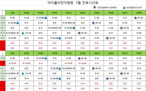 아이웰어린이병원 18.05.14~05.27 진료 시간표입니다. 페이지 정보 작성자 관리자 작성일18-05-14 08:21 조회24,386회 관련링크 이전글 다음글 목록 본문 . 이전글 다음글 목록