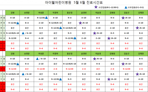 아이웰어린이병원 5월28일~6월10일 진료 시간표입니다. 페이지 정보 작성자 관리자 작성일18-05-25 18:22 조회24,678회 관련링크 이전글 다음글 목록 본문 1 이전글 다음글 목록
