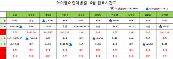 아이웰어린이병원 6.11~6.17 시간표입니다. 페이지 정보 작성자 관리자 작성일18-06-08 14:59 조회23,014회 관련링크 이전글 다음글 목록 본문 . 이전글 다음글 목록