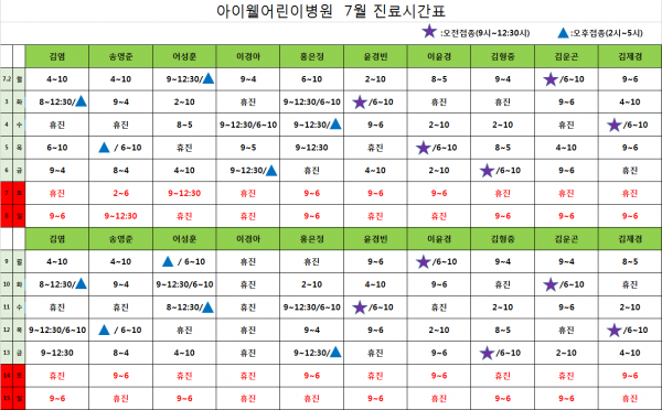 아이웰어린이병원 18.07.02~07.15 시간표입니다. 페이지 정보 작성자 관리자 작성일18-06-29 13:56 조회24,802회 관련링크 이전글 다음글 목록 본문 . 이전글 다음글 목록