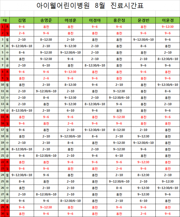아이웰어린이병원 8월 진료시간표입니다. 페이지 정보 작성자 관리자 작성일15-07-29 18:08 조회23,591회 관련링크 이전글 다음글 목록 본문 아이웰어린이병원 8월 진료시간표 이전글 다음글 목록