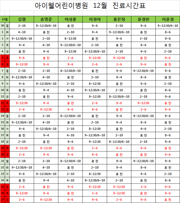 아이웰어린이병원 12월 진료시간표입니다. 페이지 정보 작성자 관리자 작성일15-12-07 17:59 조회25,462회 관련링크 이전글 다음글 목록 본문 12월 진료시간표 이전글 다음글 목록
