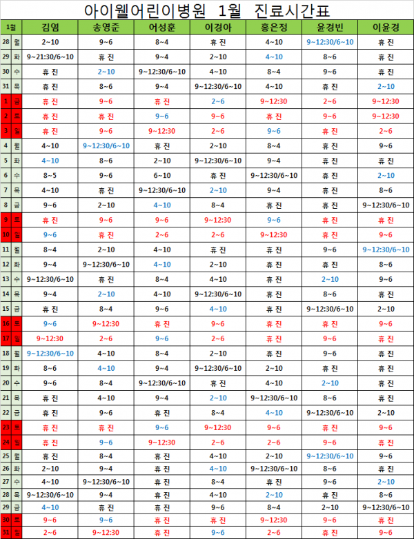아이웰어린이병원 1월 진료시간표입니다. 페이지 정보 작성자 관리자 작성일15-12-23 16:21 조회27,247회 관련링크 이전글 다음글 목록 본문 1월 진료시간표 이전글 다음글 목록