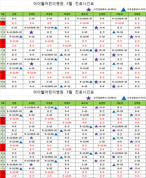 아이웰어린이병원 3월 진료시간표입니다. 페이지 정보 작성자 관리자 작성일16-03-09 15:00 조회25,686회 관련링크 이전글 다음글 목록 본문 3월 진료시간표 이전글 다음글 목록