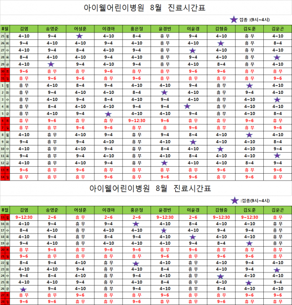 아이웰어린이병원 8월 진료시간표입니다. 페이지 정보 작성자 관리자 작성일16-07-22 09:51 조회26,385회 관련링크 이전글 다음글 목록 본문 8월 진료시간표 이전글 다음글 목록