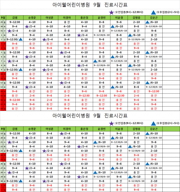 아이웰어린이병원 9월 진료시간표입니다. 페이지 정보 작성자 관리자 작성일16-09-22 13:39 조회22,577회 관련링크 이전글 다음글 목록 본문 9월 진료시간표 이전글 다음글 목록