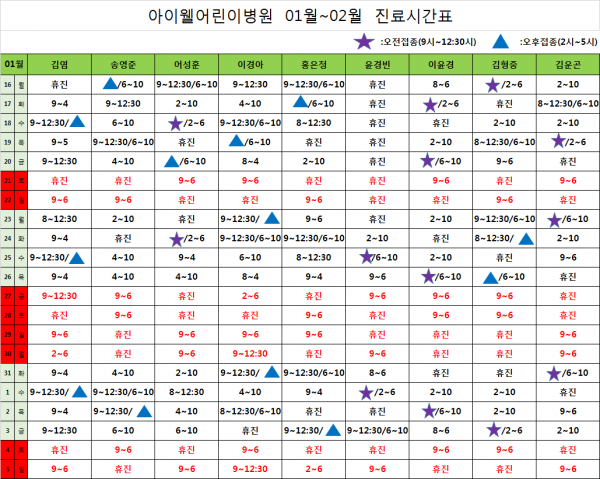 아이웰어린이병원 01월16일~02월05일 진료시간표입니다. 페이지 정보 작성자 관리자 작성일17-01-12 16:47 조회24,492회 관련링크 이전글 다음글 목록 본문 아이웰어린이병원 01월16일~02월05일 진료시간표입니다 이전글 다음글 목록