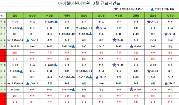 아이웰어린이병원 3.19~4.1 진료시간표 페이지 정보 작성자 관리자 작성일18-03-17 11:52 조회25,522회 관련링크 이전글 다음글 목록 본문 안녕하세요. 3월19일~4.1일 시간표입니다. 이전글 다음글 목록