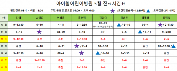 아이웰어린이병원 24.05.13~05.19 진료시간표안내입니다. 페이지 정보 작성자 관리자 작성일24-05-09 10:42 조회8,617회 관련링크 이전글 다음글 목록 본문 진료시간표는 아이웰어린이병원 인스타그램에서도 확인가능하십니다. 이전글 다음글 목록
