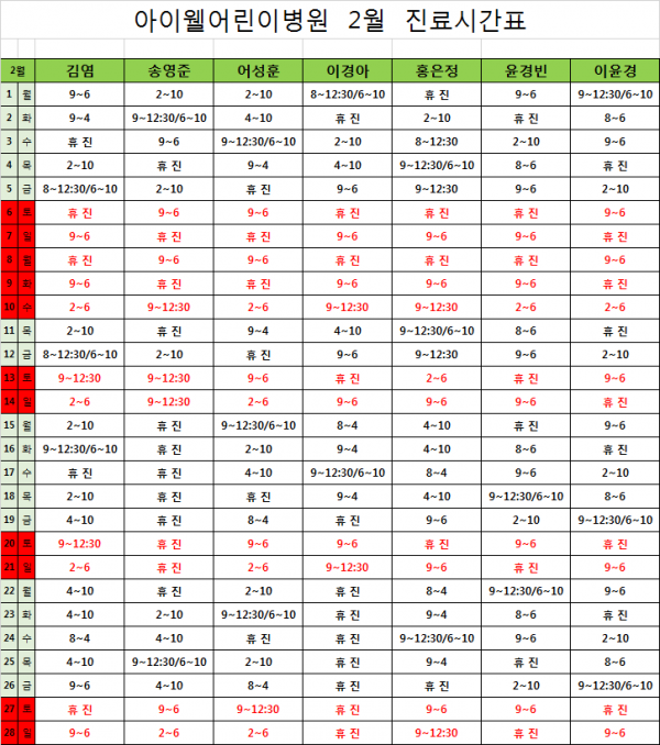 아이웰어린이병원 2월 진료시간표입니다. 페이지 정보 작성자 관리자 작성일16-02-10 08:45 조회21,995회 관련링크 이전글 다음글 목록 본문 2월 진료시간표 이전글 다음글 목록