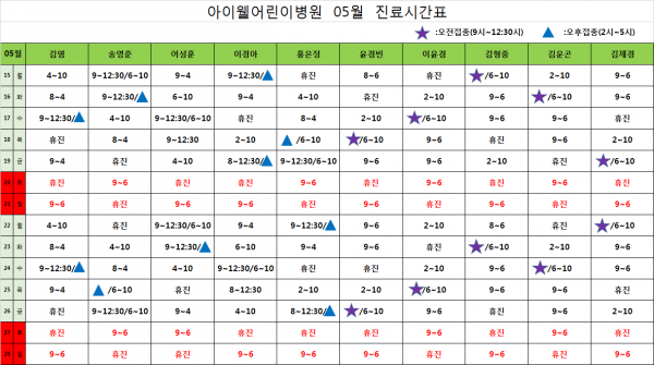 아이웰어린이병원 5.15~5.28 시간표 페이지 정보 작성자 관리자 작성일17-05-08 16:33 조회24,357회 관련링크 이전글 다음글 목록 본문 5월 15일부터 5월 28일 시간표입니다. 이전글 다음글 목록