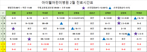 아이웰어린이병원 25.02.03~02.09 진료시간표 안내입니다. 페이지 정보 작성자 관리자 작성일25-01-28 14:36 조회5,520회 관련링크 이전글 다음글 목록 본문 . 이전글 다음글 목록