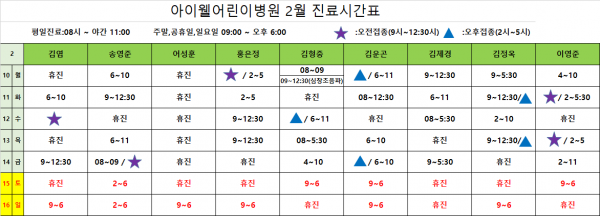 아이웰어린이병원 25.02.10~02.16 진료시간표 안내입니다. 페이지 정보 작성자 관리자 작성일25-02-07 20:04 조회4,966회 관련링크 이전글 다음글 목록 본문 진료시간표는 아이웰어린이병원 인스타그램에서도 확인가능합니다 이전글 다음글 목록