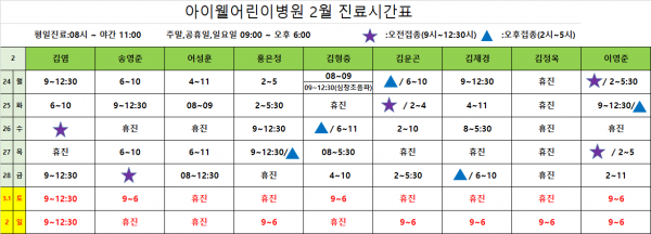 아이웰어린이병원 25.02.24~03.02 진료시간표 안내입니다. 페이지 정보 작성자 관리자 작성일25-02-20 15:40 조회5,197회 관련링크 이전글 다음글 목록 본문 진료시간표는 아이웰어린이병원 인스타그램에서도 확인가능합니다 이전글 다음글 목록