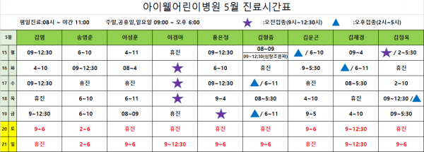 아이웰어린이병원 23.05.15~05.21 진료시간표입니다. 페이지 정보 작성자 관리자 작성일23-05-10 10:47 조회12,563회 관련링크 이전글 다음글 목록 본문 . 이전글 다음글 목록