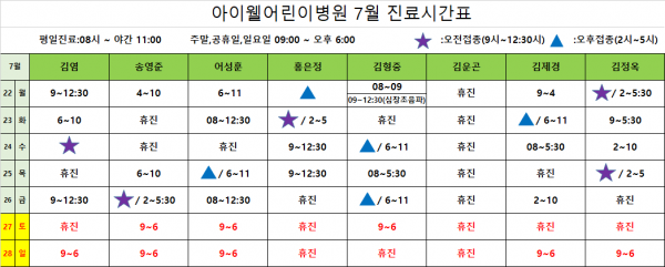 아이웰어린이병원 24.07.22~07.28 진료시간표안내입니다. 페이지 정보 작성자 관리자 작성일24-07-17 10:59 조회9,008회 관련링크 이전글 다음글 목록 본문 .진료시간표는 아이웰어린이병원 인스타그램에서도 확인가능합니다 이전글 다음글 목록