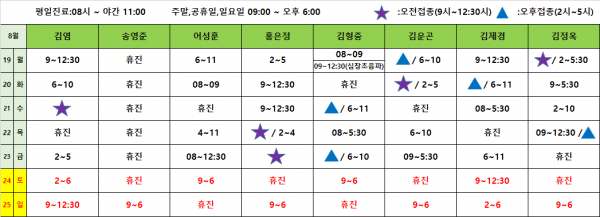 아이웰어린이병원 24.08.19~08.25 진료시간표안내입니다. 페이지 정보 작성자 관리자 작성일24-08-14 09:45 조회8,403회 관련링크 이전글 다음글 목록 본문 .진료시간표는 아이웰어린이병원 인스타그램에서도 확인가능합니다 이전글 다음글 목록