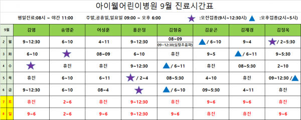 아이웰어린이병원 24.09.02~09.08 진료시간표안내입니다. 페이지 정보 작성자 관리자 작성일24-08-29 17:55 조회8,062회 관련링크 이전글 다음글 목록 본문 진료시간표는 아이웰어린이병원 인스타그램에서도 확인가능합니다 이전글 다음글 목록