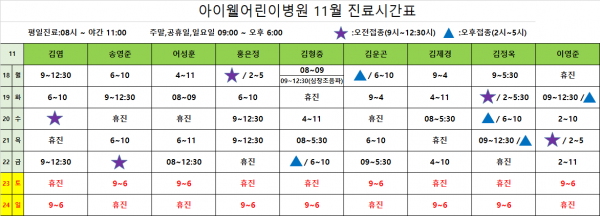아이웰어린이병원 24.11.18~11.24 진료시간표안내입니다. 페이지 정보 작성자 관리자 작성일24-11-14 15:21 조회6,874회 관련링크 이전글 다음글 목록 본문 진료시간표는 아이웰어린이병원 인스타그램에서도 확인가능합니다 이전글 다음글 목록