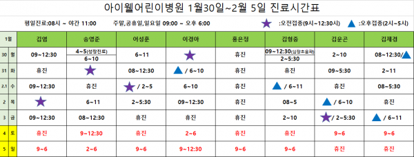 아이웰어린이병원 1월30일~2월 5일 진료시간안내입니다. 페이지 정보 작성자 관리자 작성일23-01-25 09:47 조회11,294회 관련링크 이전글 다음글 목록 본문 . 이전글 다음글 목록