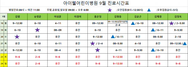 아이웰어린이병원 23.09.18~09.24 진료시간표입니다 페이지 정보 작성자 관리자 작성일23-09-14 16:17 조회11,481회 관련링크 이전글 다음글 목록 본문 . 이전글 다음글 목록