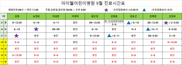 아이웰어린이병원 23.09.25~10.01 진료시간표안내입니다. 페이지 정보 작성자 관리자 작성일23-09-18 11:13 조회12,731회 관련링크 이전글 다음글 목록 본문 . 이전글 다음글 목록