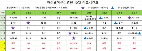 아이웰어린이병원 23.10.16~10.22 진료시간표입니다. 페이지 정보 작성자 관리자 작성일23-10-15 10:58 조회10,740회 관련링크 이전글 다음글 목록 본문 . 이전글 다음글 목록