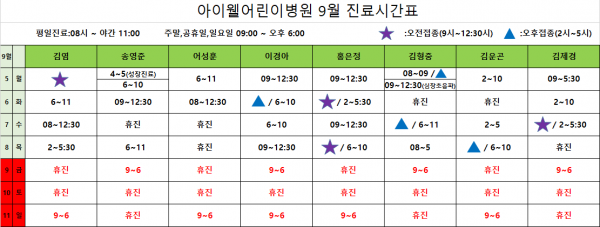 아이웰어린이병원 9.5~9.11 진료시간표입니다. 페이지 정보 작성자 관리자 작성일22-08-31 14:51 조회12,628회 관련링크 이전글 다음글 목록 본문 . 이전글 다음글 목록