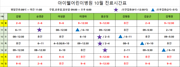 아이웰어린이병원 22.10.10~10.16 진료시간표입니다, 페이지 정보 작성자 관리자 작성일22-10-07 09:19 조회12,308회 관련링크 이전글 다음글 목록 본문 . 이전글 다음글 목록
