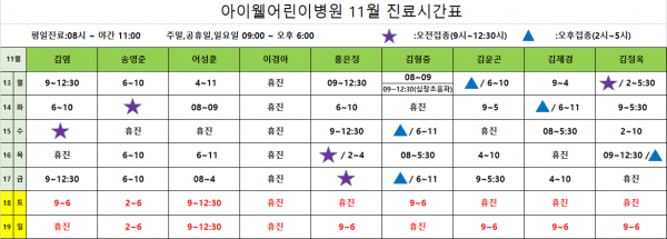아이웰어린이병원 23.11.13~11.19 진료시간표안내입니다. 페이지 정보 작성자 관리자 작성일23-11-08 11:12 조회10,901회 관련링크 이전글 다음글 목록 본문 . 이전글 다음글 목록