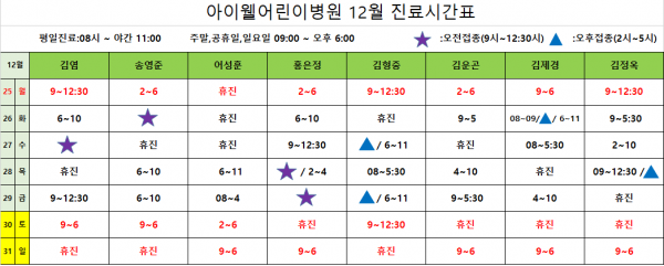 아이웰어린이병원 23.12.25~12.31 진료시간표안내입니다. 페이지 정보 작성자 관리자 작성일23-12-19 09:34 조회10,768회 관련링크 이전글 다음글 목록 본문 . 이전글 다음글 목록