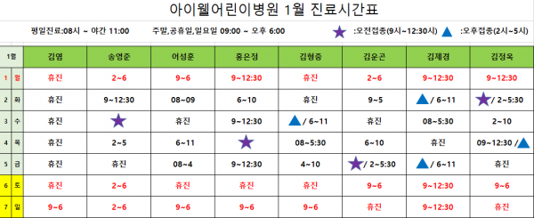아이웰어린이병원 24.1.1~1.7 진료시간표입니다. 페이지 정보 작성자 관리자 작성일23-12-27 14:22 조회10,563회 관련링크 이전글 다음글 목록 본문 . 이전글 다음글 목록