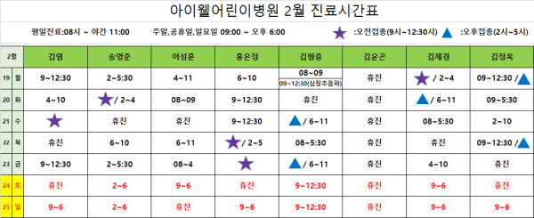 아이웰어린이병원 24.02.19~02.25 진료시간안내입니다. 페이지 정보 작성자 관리자 작성일24-02-15 16:00 조회9,471회 관련링크 이전글 다음글 목록 본문 . 이전글 다음글 목록