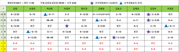아이웰어린이병원 26.03.30~04.05 진료시간표입니다. 페이지 정보 작성자 관리자 작성일26-03-26 16:00 조회1,541회 관련링크 이전글 다음글 목록 본문 진료시간표는 아이웰어린이병원 인스타그램에서도 확인 가능합니다. 예약취소는 카카오채널을 이용해주세요. 이전글 다음글 목록